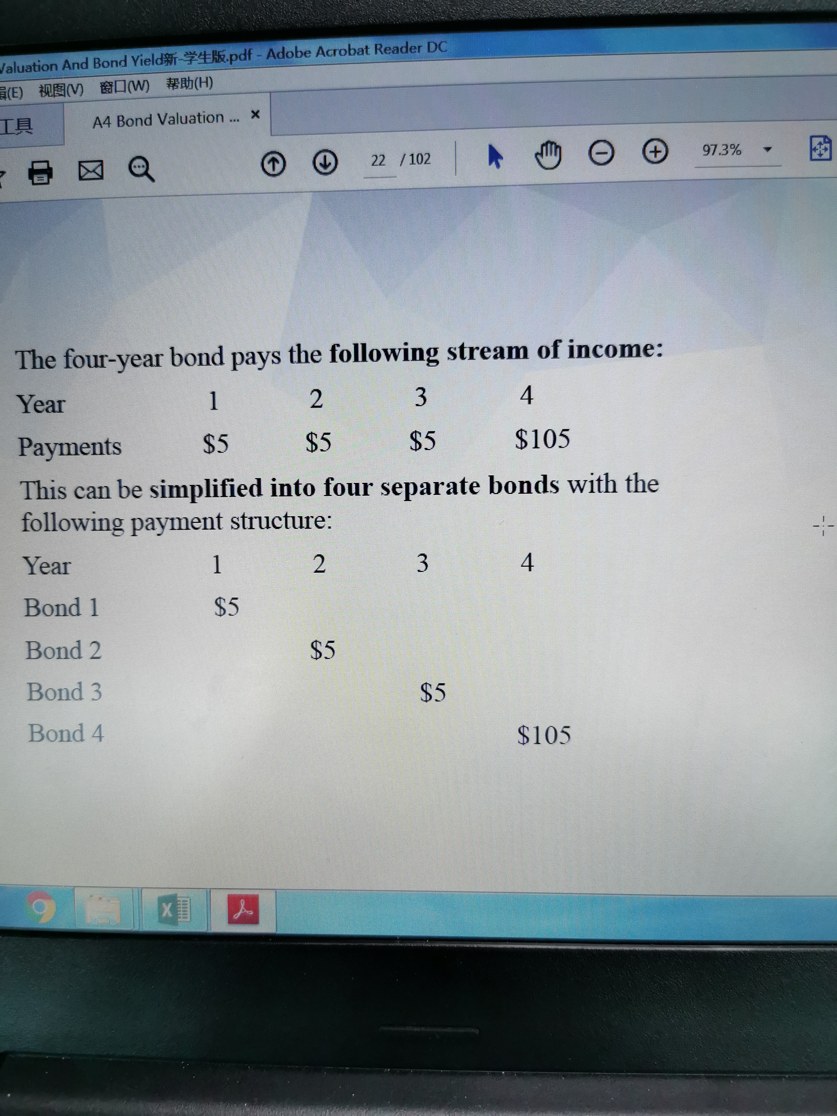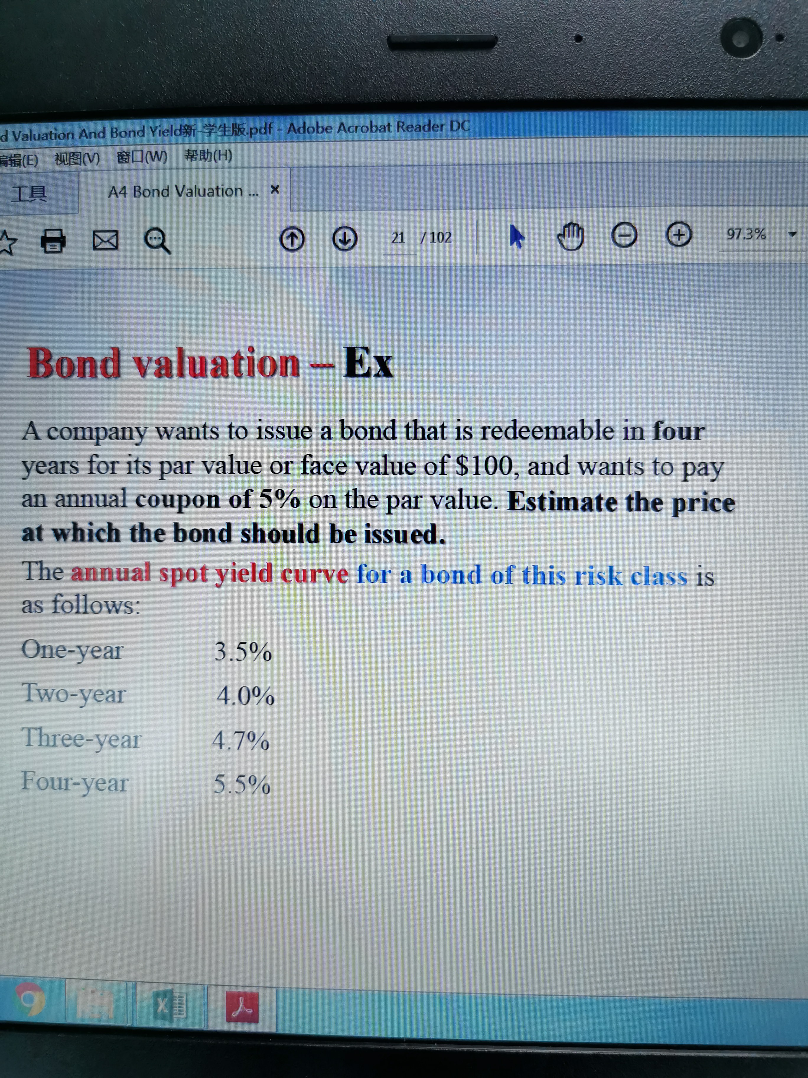 利用98.57 作为 PV,然后105作为 FV,然后year为四年,计算出来的平均利率