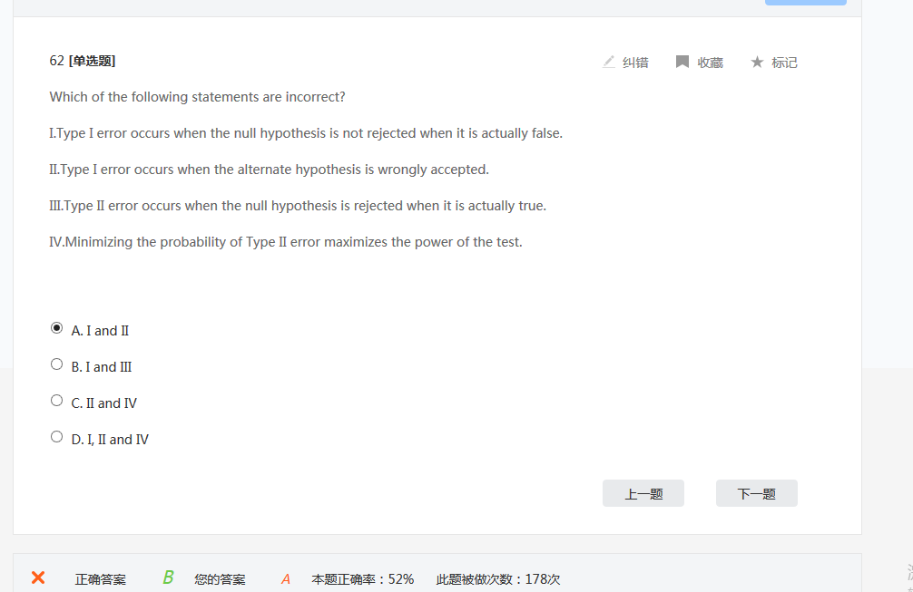 同学你好,type I error是去真,是针对原假设说的。H0是真的被拒绝。也就是H1是假的被接受。所以第二句话是对的,题目让选不对的,就不选第二句。