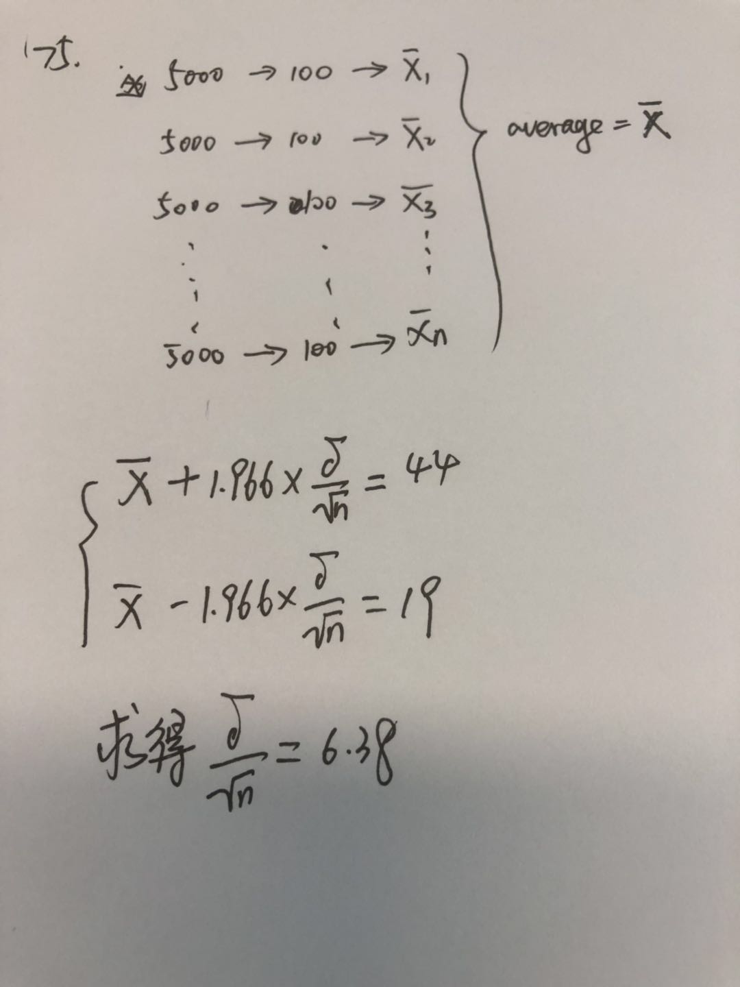同学你好。这个题不是常规题,思路是这样的:5000里面每次取出100个,求得一个X1,取n次得到X1——Xn。这些X求平均得到样本平均X。然后带入公式,联立反推出结果。答案选C