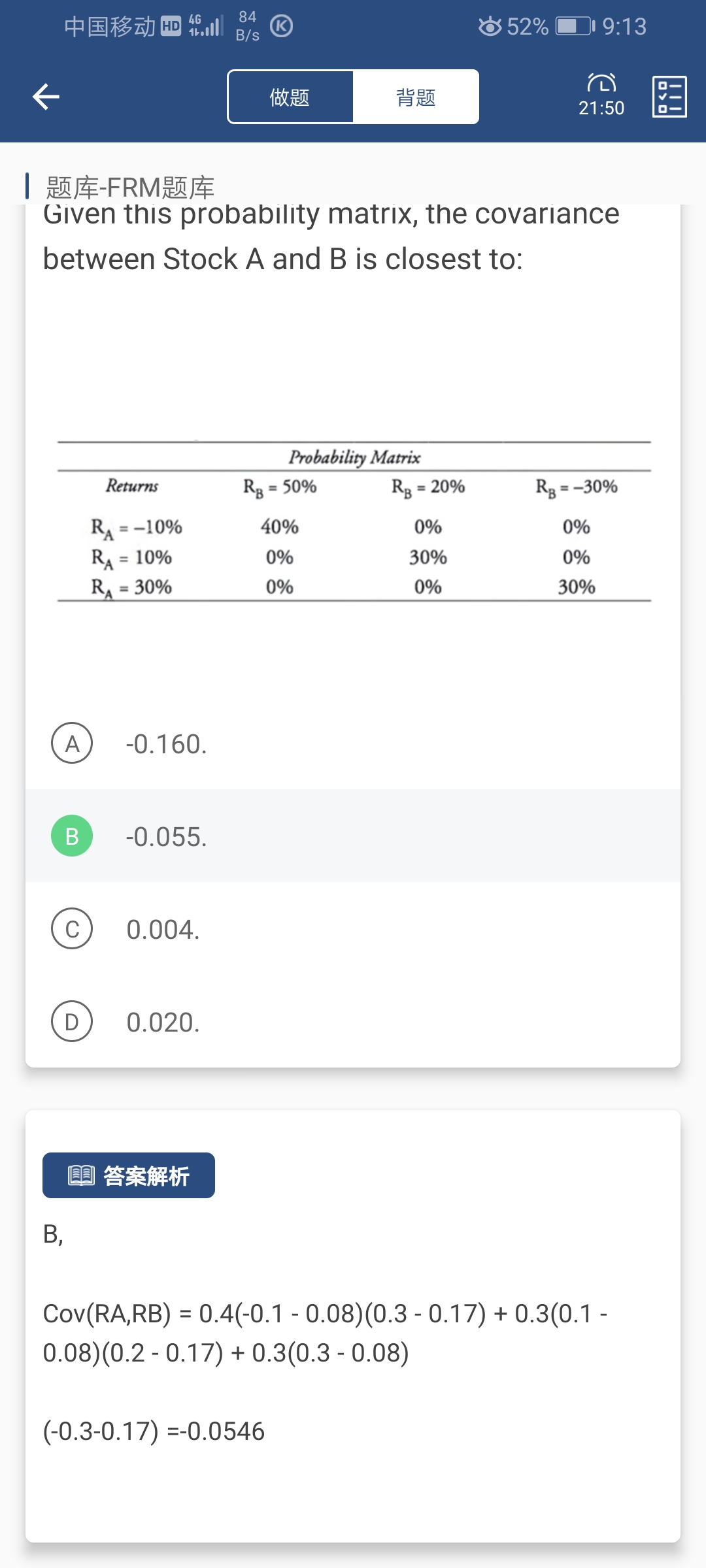 这道题考察的就是协方差公式cov(x,y)=E【x-E(X)][y-E(y)】,只不过均值是用加权平均算的,0.08就是E(Ra),0.17就是E(Rb)。