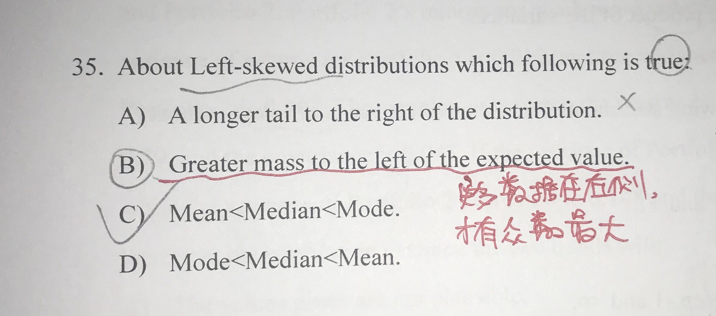 你把greater mass当成众数来理解,左偏的情况下,众数应该在均值的右边,所以B错。