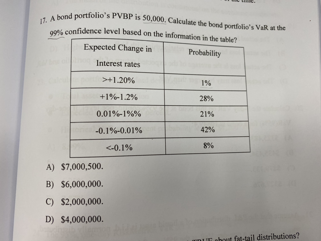 这道题让求的是债券组合的VaR,表格中给出的数据有预期的利率变动区间和对应的概率值,因为债券的价格和利率成负相关,当预期利率上升,债券价格下降,进而债券组合的VaR会增加,所以此题就变成了求1%显著度水平下的VaR,也就是利率上升在1%的概率下的VaR,也就是120(1.2%对应就是120个基点)*50000=600000