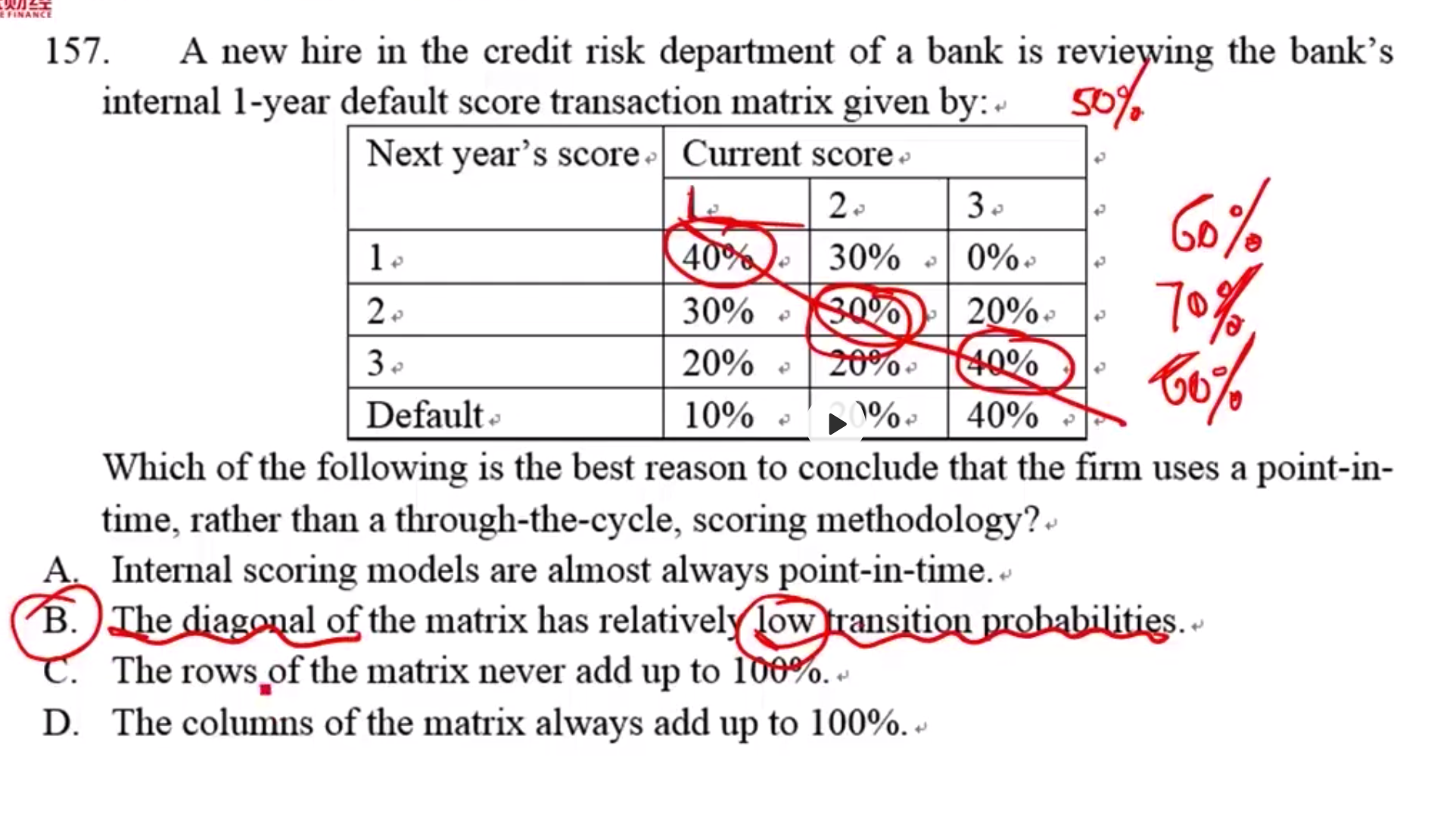 同学你好,这道题考察的是时点法和周期法的区别,如果是时点法的话,那么在信用迁移矩阵表中对角线上的概率值(即一年内评级状态保持不变的概率)较小,说明一年内评级状态保持不变的概率比较小,也就是说一年内评级变动的概率比较大,所以答案选B。
