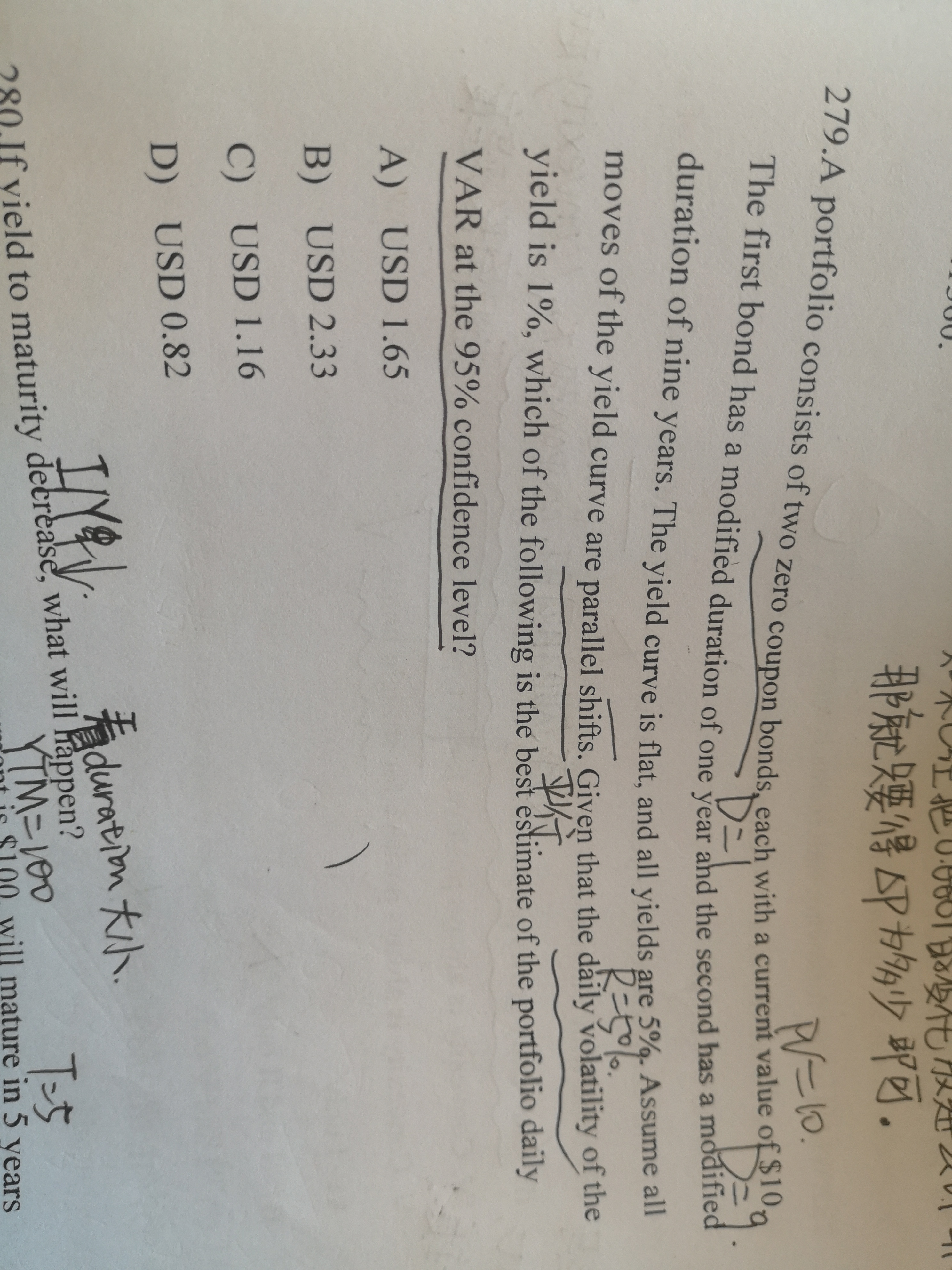 同学你好,这道题考察的就是delta-normal法在固定收益类证券方面的应用,带入公式即可,久期衡量的是利率对债券价格的敏感程度,久期乘以利率的变化量就是债券价格的变动量,而VaR衡量的是利率的波动对债券价格造成的损失。详细过程可以再去听一下网课。