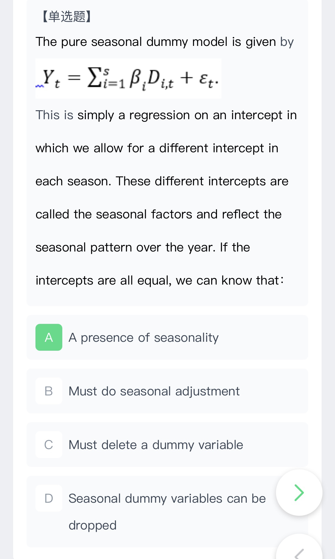 同学你好,这个模型没有截距项,那么每个dummy对应的系数γ都反映相应“季节”对Y的影响。 季节性因素是指因为季节的变化,对应Y有不同的影响。那么如果每个γ都一样,就意味着所有“季节”对Y的影响也是一样的,说明没有季节性特征,那么就不需要在模型里加入季节性因素的部分。也就是A选项的意思。