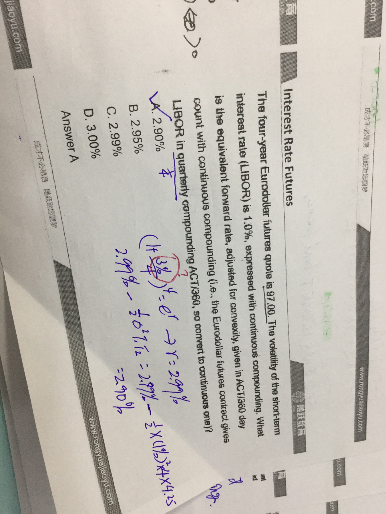 同学你好,根据欧洲美元的报价机制,报价=100-R(欧洲美元期货隐含的远期利率),由于4年的欧洲美元期货的报价为97,所以对应的隐含远期利率为3%。