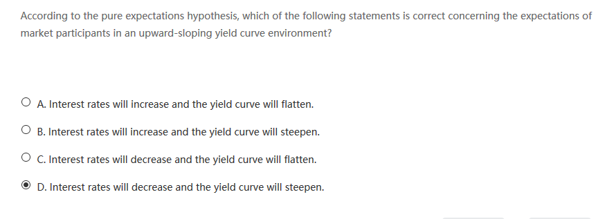 同学你好,这道题考察的是纯预期理论,就是当即期利率上涨时,利率曲线变得更陡峭。