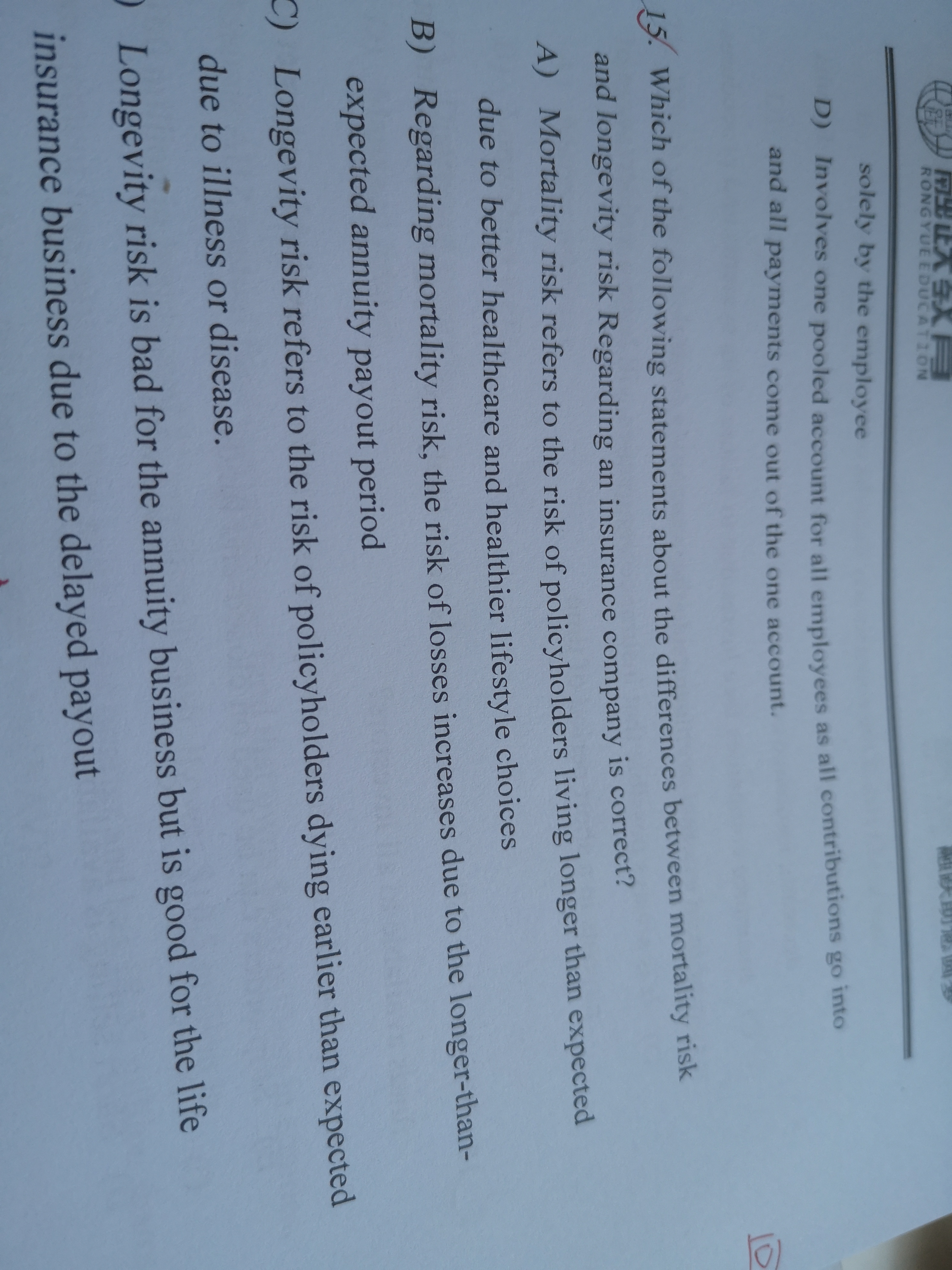 同学你好,A和B选项说的是长寿风险而不是道德风险,C选项说的也不是长寿风险,况且长寿风险是针对保险公司而不是针对保单持有人。