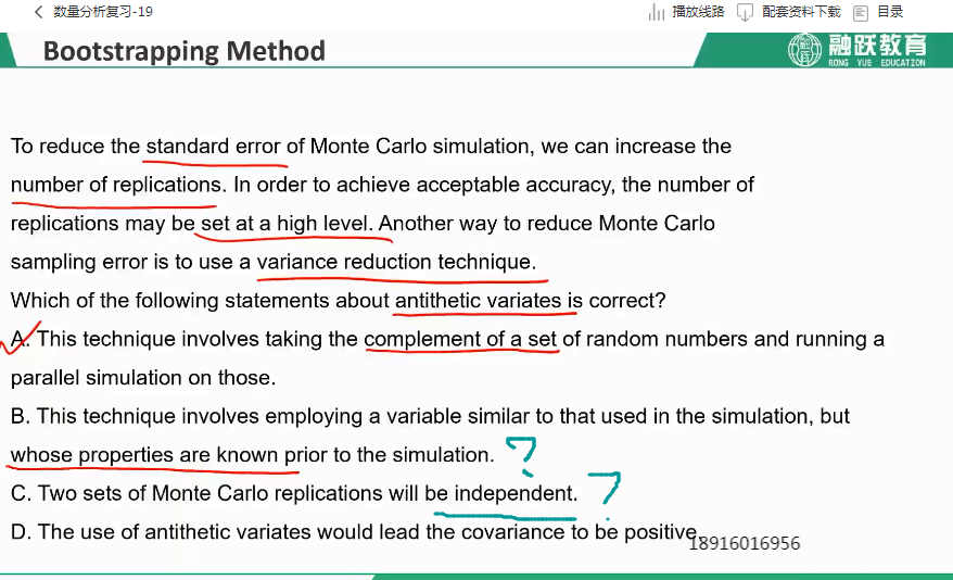 同学你好,关于B选项说的是引入一个类似的变量去进行模拟,而这个引入的变量的性质是提前已知的,这就是控制变量法的基本思想;关于C选项说的是在对偶变量法中,因为是先抽取一部分,然后对剩余部分(子集)再进行抽样,因为这两次抽样都是在一个总体数据里,所以说这两次抽样的数据不是独立的。