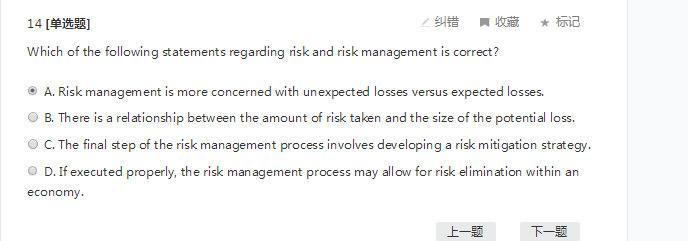 同学你好,风险管理的过程的最后一步是对风险管理系统进行事后评估。