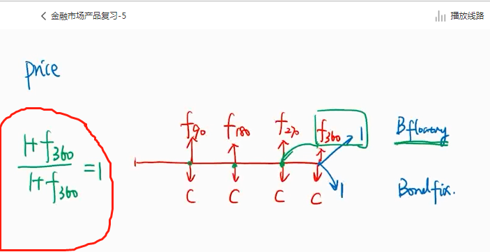 同学你好,图中绿色圈出来的内容是说当浮动端债券的本金为1时,求f270时间点的债券价格时就是用债券期末本息往前用当期浮动利率折现一期,就是1*(1+f360)/(1+f360),最终结果是等于债券本金(面值),这个过程就是债券互换浮动端在每个付息点回归面值的过程和原因。