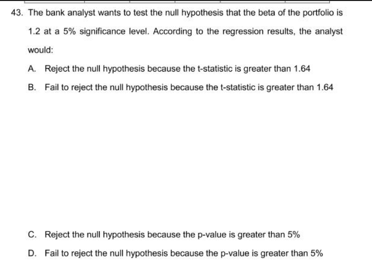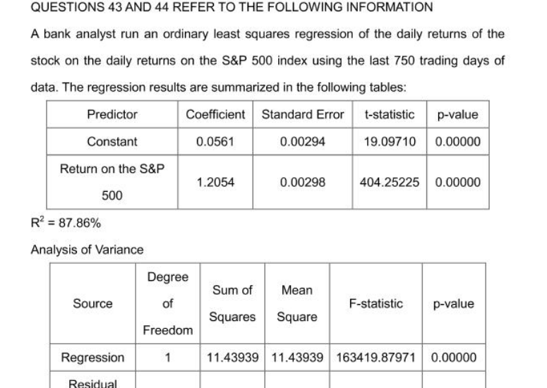 这个表格下面是两道题,我不知道你问的哪一道,这两个分别是两道题对应的正确选项。 Fail to reject the null hypothesis because the p-value is greater than 5%, The decreased adjusted R2 suggests that the coefficient of the returns on the DJIA is not significant.