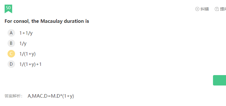 不是的,永续债的修正久期MD等于1/y。永续债的麦考林久期等于MD*(1+y)=1+1/y.所以选择的应该是A。