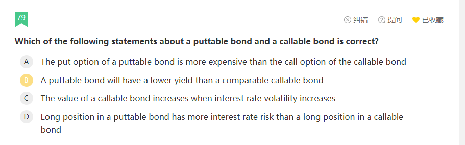 同学你好,首先根据含权债券的定义:puttable bond可回售债券的价值=普通债券+put option和callable bond可赎回债券=普通债券-call option ,关于A选项,根据含权债券涨多跌少的特点(即当利率下跌时债券价格上涨的变化量比当利率上涨时债券价格下跌的变化量),可知含权债券中call option的价值比 put option的价值更大,所以A错;关于C选项,根据callable债券的定义公式可知,含权债券相当于一个普通债权加上一个call option,波动率与债券的关系都是正相关,当波动率越大,call option的价值就越大,进而callable option的价值就越大,所以C错;关于D选项,跟A选项的解释类似,涨多跌少的特征让callable bond的价格对利率的敏感性比putable bond更大,所以前者应该有更大的利率风险。
