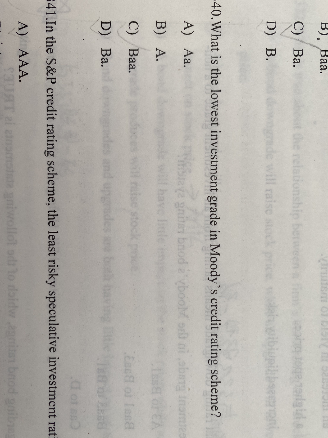 同学你好,是应该选C,题目问的是最低的投资级,就是Baa
