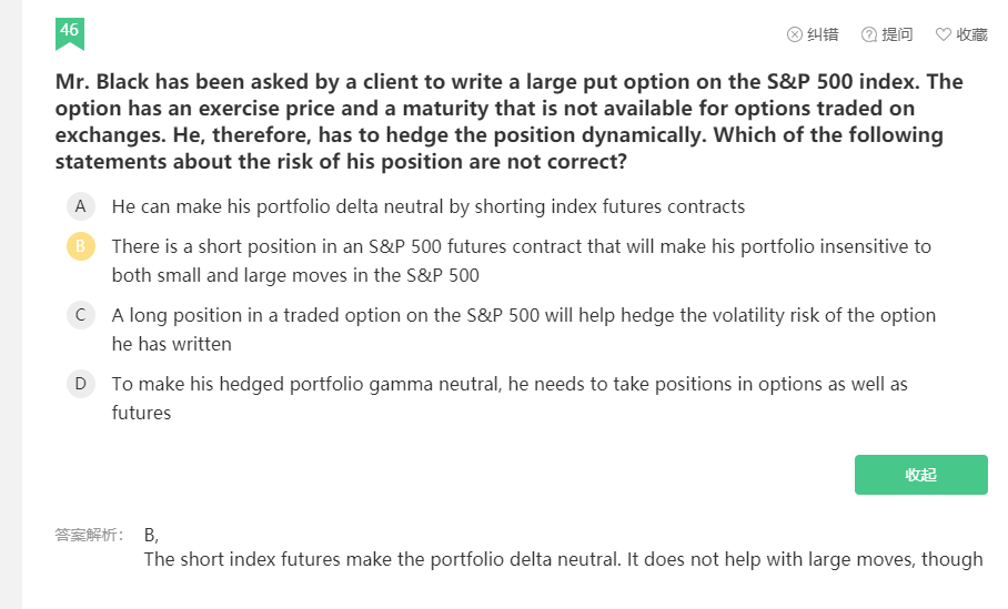 解析里the short index futures make the portfolio delta neutral与A选项对应,题目要求选出错误选项,B选项中说short position in an S&P 500 futures contract使投资组合对S&P 500大或小的变动都不敏感是错误的,short position in an S&P 500 futures contract使投资组合对S&P 500小的变动不敏感