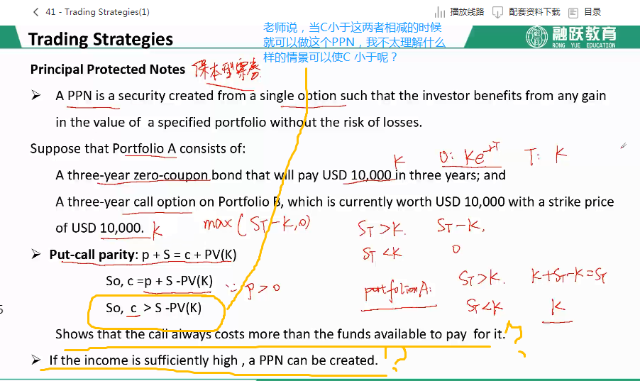 1蓝色问题:这里说的是一种市场现象,比如说投资者可能会从市场上发现此时的call的价格低于后者; 2.黄色第一问:是对PPN组合的解释。在PPN中,有个零息债的头寸,期初价值为Ke^-rt(期末的面值也是期末的价值为K),c的值会大于零息债期初期末的价值差额,这是从公式中c=p+s-Ke^-rt可以 推导出来的。 3.黄色第三问:如果套利空间足够大(c的市场价格足够低),就可以通过PPN来获利。