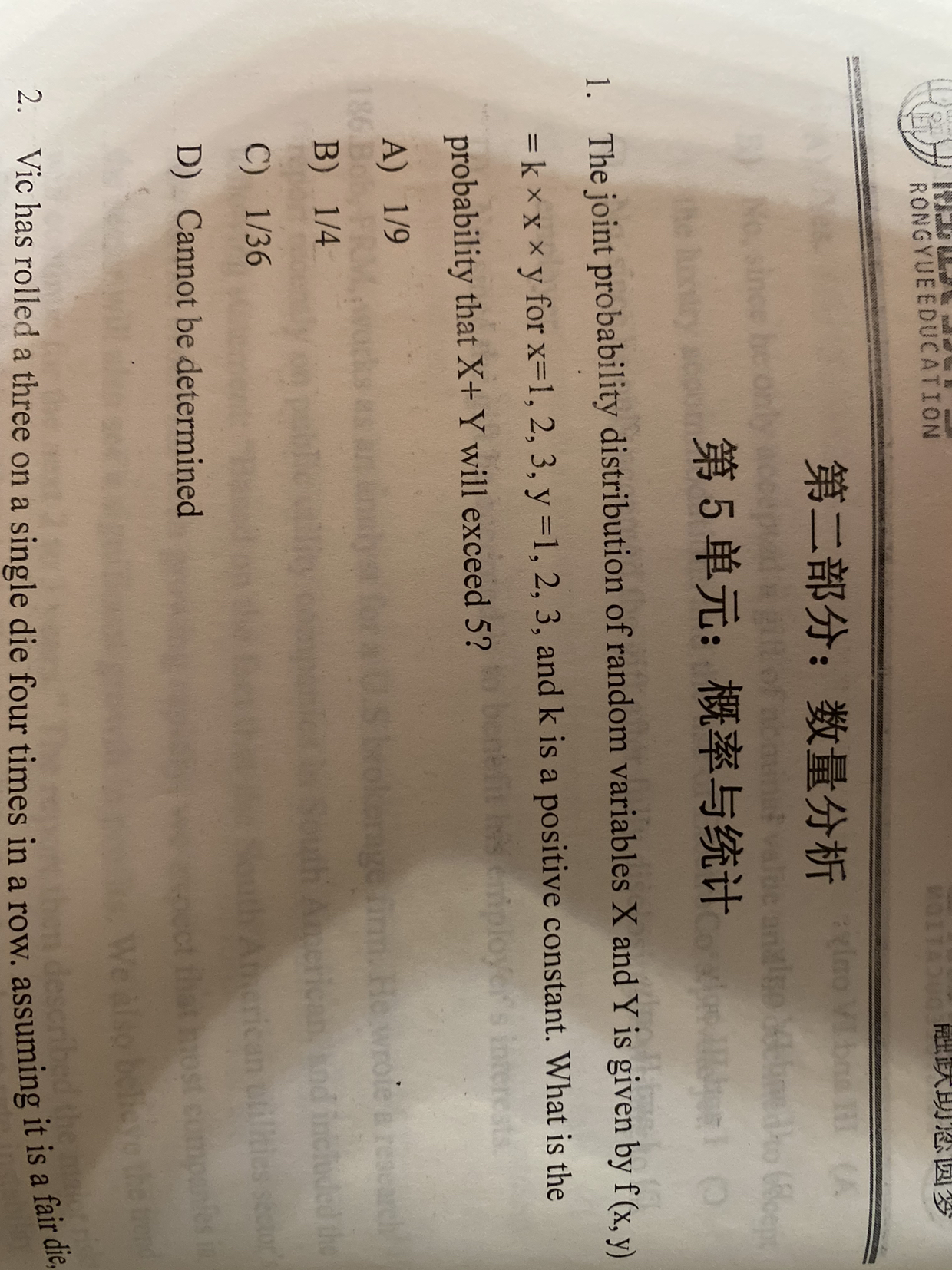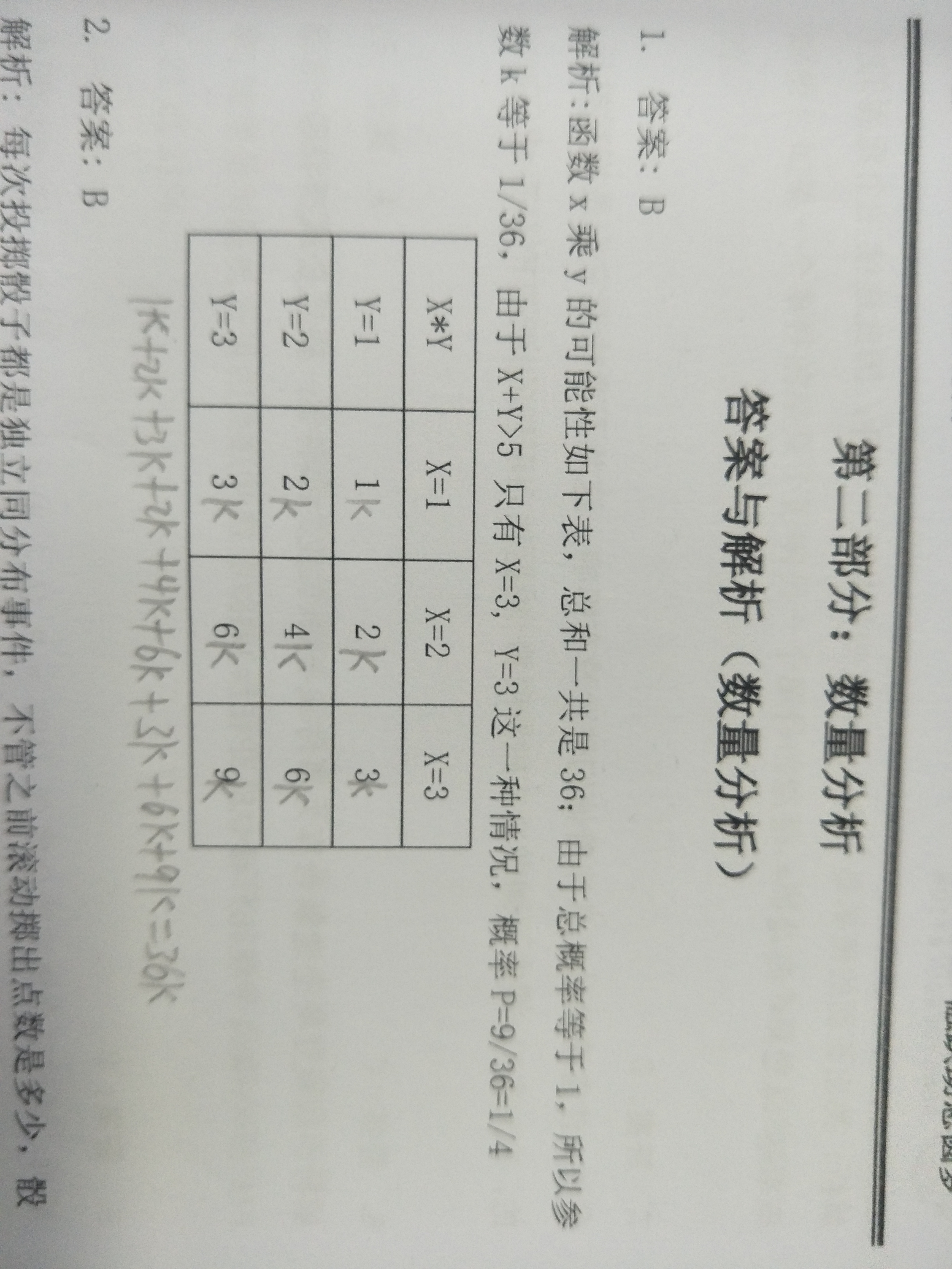 同学你好,首先,这道题要求的是X+Y>5在联合概率密度函数中函数f(X,Y)=k*X*Y中的概率,计算概率首先要知道该函数的无条件概率即分母是多少,根据答案中的概率矩阵可知,有九种可能性之和应该为1,即36k等于1,则k=1/36,而当X=3,Y=3时,f(x,y)=9k,全概率为36k,此时所求概率即为9k/36k=1/4.