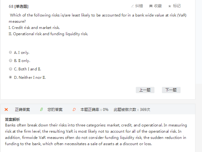 Bank often break down their risks into three categories:1.market risk 2.credit risk 3.operational risk.没有融资流动性风险.解析是说在衡量企业层面的风险时,VaR最有可能没有考虑到所有的运营风险,此外,全公司的VaR指标通常不考虑融资流动性风险,即银行资金的突然减少,这通常需要折价或亏损出售资产。