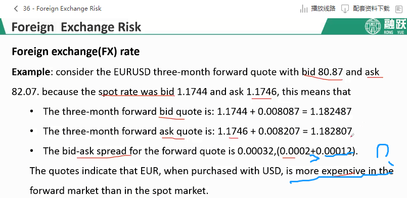 老师还有蓝色的部分,老师说,欧元在远期市场中的价格比现货市场的价格更贵,是因为说bid>ask的数值的原因吗?