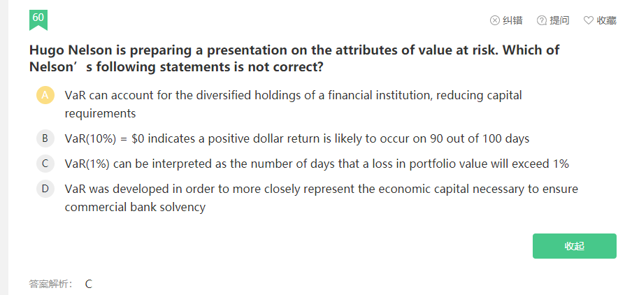 同学你好,A是对的,因为考虑组合的分散化的情况下会直接体现在计算VaR的参数op上面,确实能直观的达到降低资本金需求的目的。C错的,VaR 1%可以翻成一百天中有一天会超过该损失,或者说从1%的显著度看一短时间内的最小损失,从99%置信度看一段时间内的最大损失。只从VaR 1%我们是看不出来损失的程度的,C错在对损失程度进行了描述,这里我们连收益率和波动率这些参数都不知道。