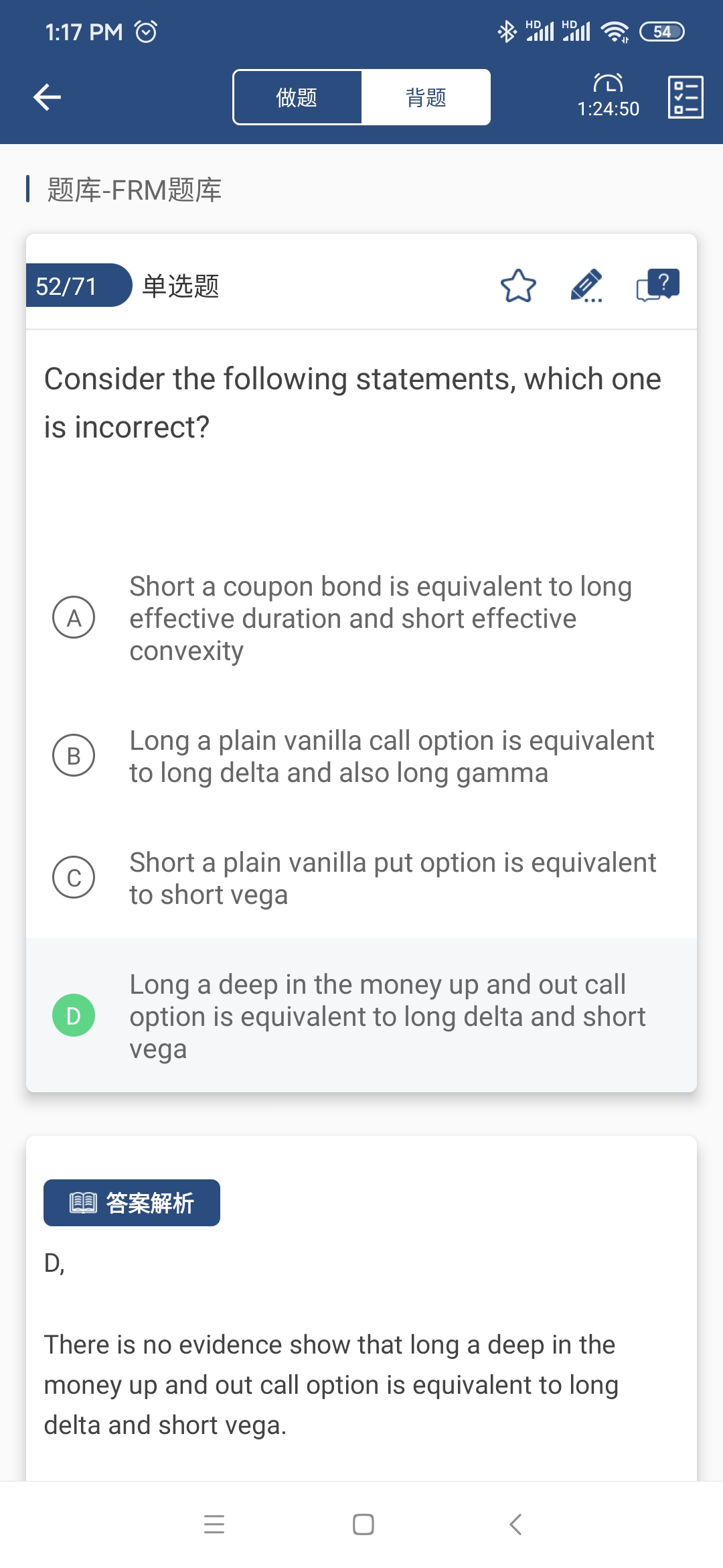 同学你好,D选项应该是short delta,因为在deep in the money 时,当波动率较大时对up and out call是反向影响,波动率越大越会up and out ,期权价值越小。对于call option 而言,short delta和short vega的方向是一致的。