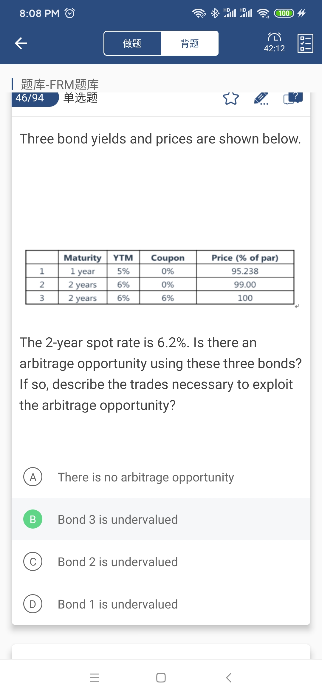 从题目上看,按照6.2%的折现率,债券2的价格明显被高估,所以应该是买入一份债券3,按照现金流卖出0.06份债券1和1.06份债券2。 债券3的pv小于100,也是被高估了。但是买的是被低估的,卖的的是被高估的。选项给的只有被低估的,所以只能选B
