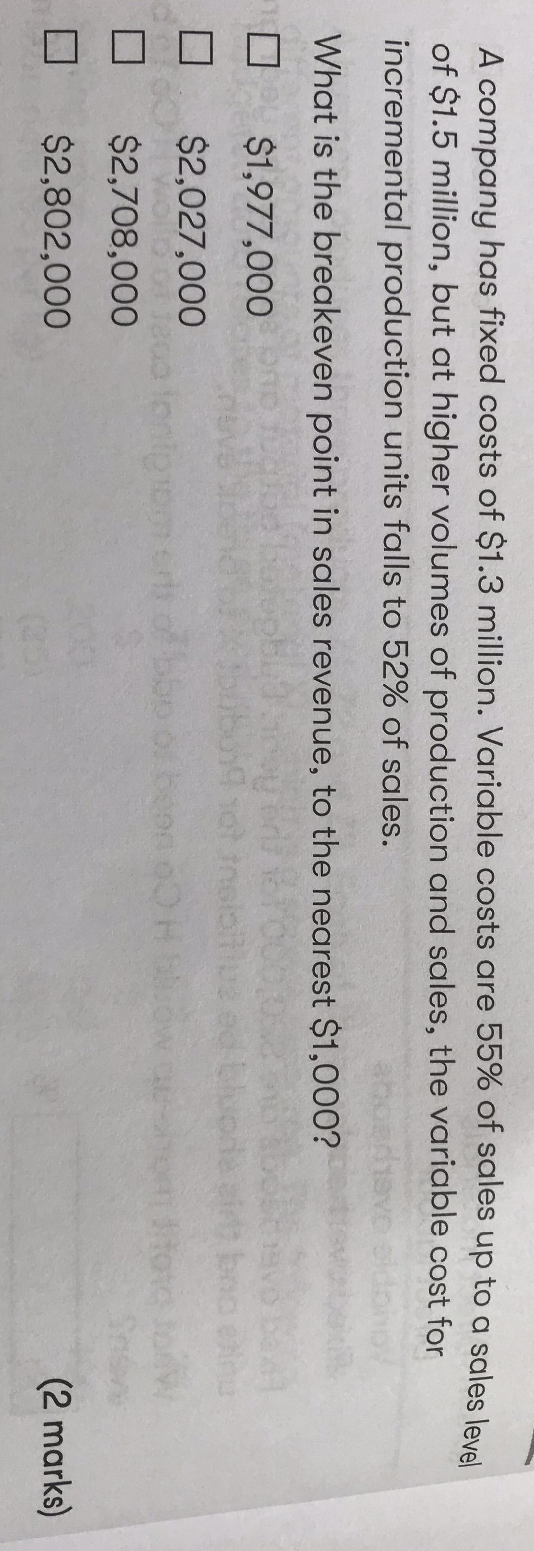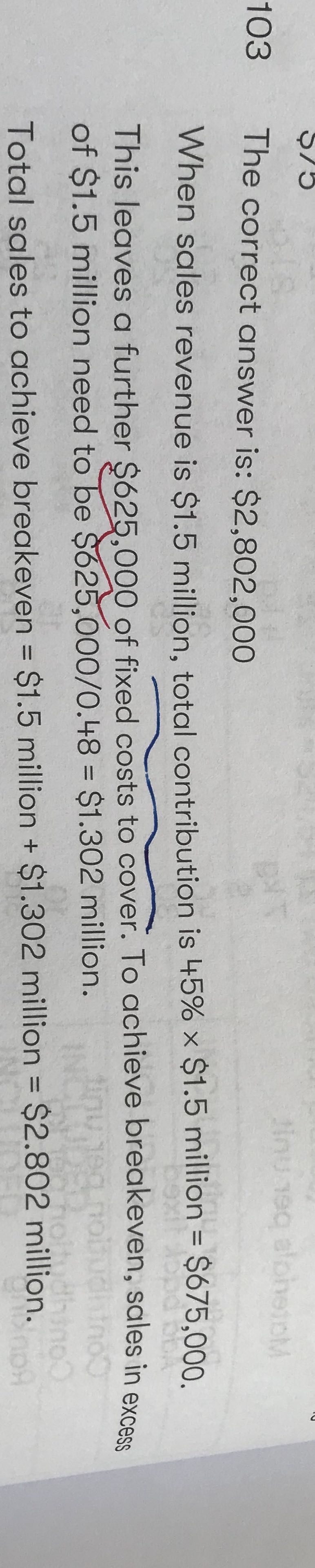 Profit =contribution -fixed cost,contribution = 675000,Fixed cost=1.3m, Break-even point 处 Profit=0,所以我们的fixed cost 还可以有1.3m-675000=625000
