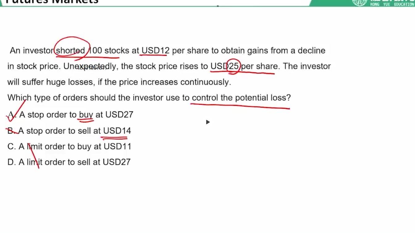 同学你好,stop order是止损单,当市场价格朝向不利方向变动时,一旦达到交易者制定的价格时平仓止损。而limit order是限价单,如果是买单,当市场价格低于目标成交价时买入,高于目标成交价时卖出。本题明显说的是止损单,所以要用stop order