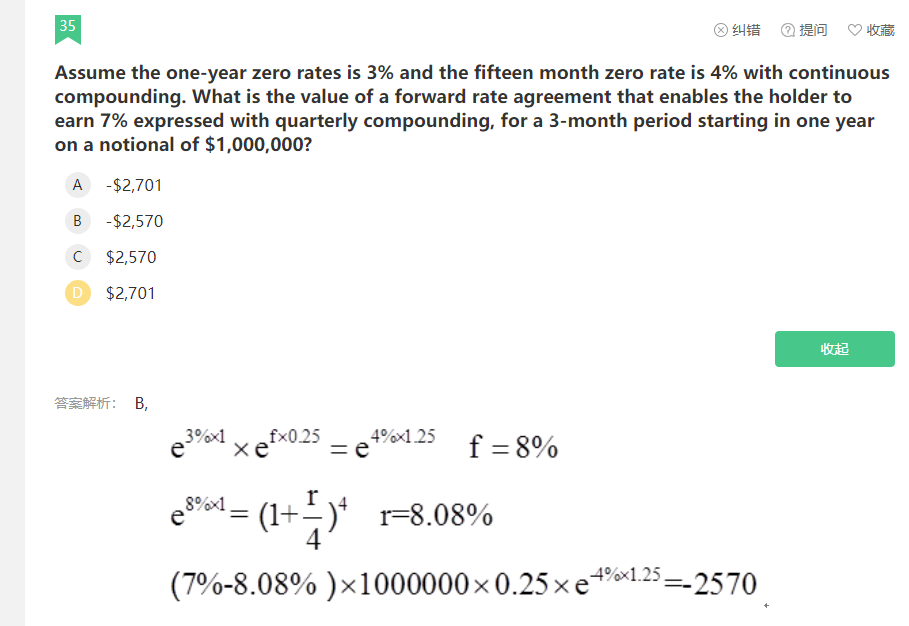 同学你好,第二步是把从一年开始为期3个月的远期利率(连续复利算的),但根据题意最终计算远期合约价值时用的是按季度复利,所以需要从连续复利转换为按季度复利,这就是第二步的意思;第四步是把远期合约(为期三个月)的价值(合约预期收益减去市场远期利率)折现到现在时刻(因为根据题意,要计算的是现在时刻的远期价值,所以要折现到现在时刻),7%是远期合约的收益,不是市场利率,不能作为折现率,而0.04是从0时刻到一年半的远期利率也就是0到1.5年的即期利率,是可以作为折现率的。可参考图片理解