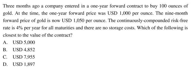 同学你好,这道题是让求远期合约的价值,可以直接利用公式计算(Ft-F0)*e-rt,其中,Ft是在现在时刻的远期合约市场价格,F0是指在零时刻(也可以理解为过去某一时刻)远期合约的市场价格,两者相减就是远期合约的价值(即签订远期合约的价格减去没有签订远期合约的市场价格),然后把差值折现到现在时刻就是远期合约现在时刻的价值