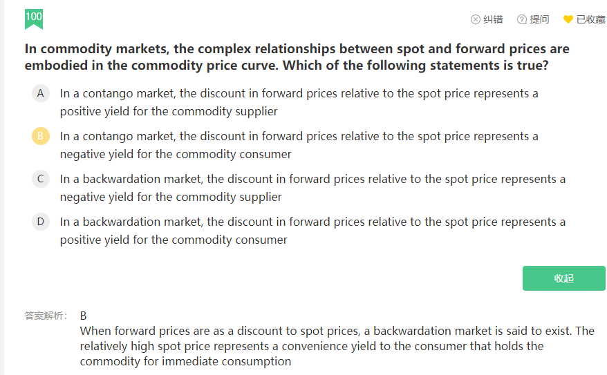 同学,这题的答案应该是D。Forward prices as a discount to spot prices的意思是远期价格是即期价格的折扣,意思是远期价格低于即期价格,反向市场。