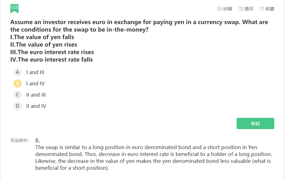收欧元支日元,在日元贬值和欧元升值(利率下降的时候,欧元债券价值上升)的时候是实值的。在货币互换中,将两端都看做是债券进行分析。