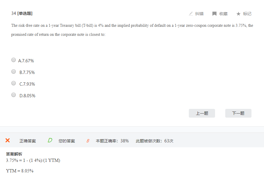 在此题目中,默认RR=0则LR=1,故PD=(1/LR)*[1-(1+risk free rate)/(1+YTM)]=(1/1)*[1-(1+4%) / (1+YTM)]=3.75%,求得YTM=8.05%