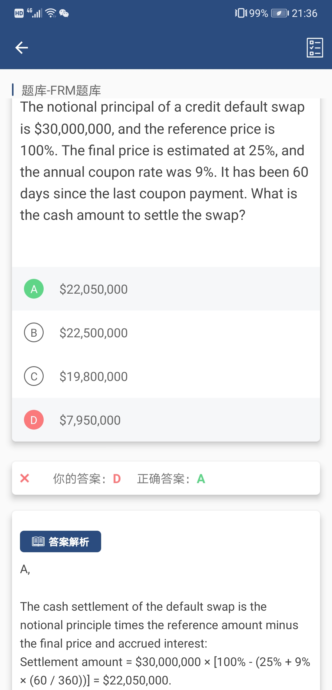 The most common type of CDS is a cash-settled CDS in which the protection seller makes a single cash payment to the protection buyer (upon the occurrence of an event of default) equal to the par value of the defaulted asset minus the current market price of the asset,在此题目中the current market price of the asset包含accrued interest,故减去