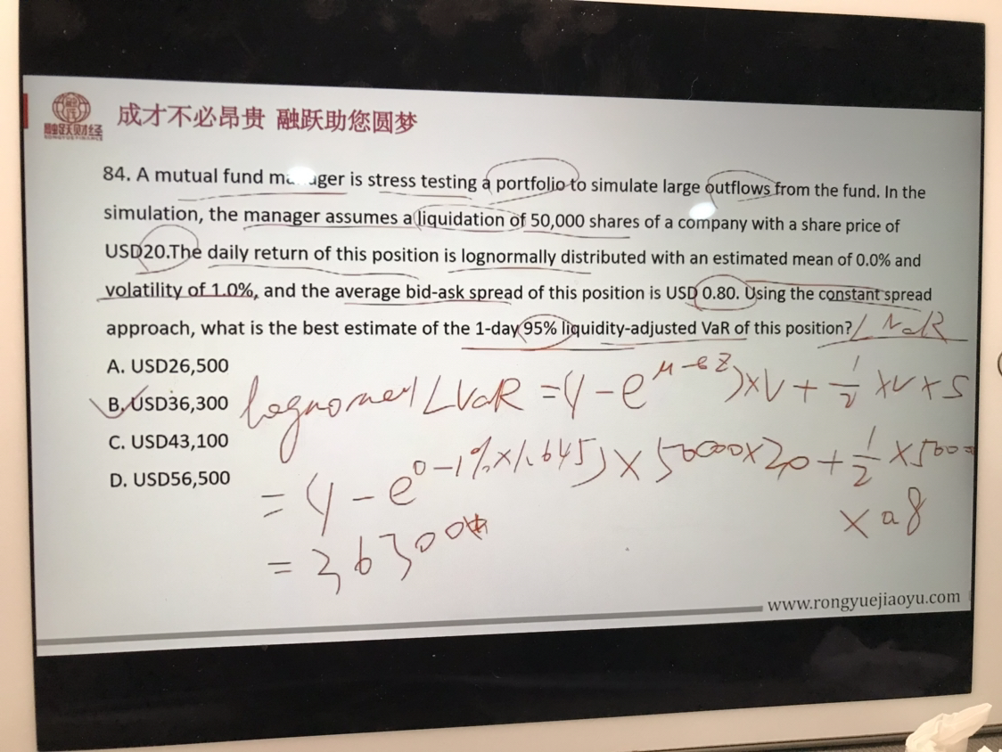 83.题目有点不严谨,CDS的结算有两种形式:现金交割就是C,实物交割就是D;84.对LVaR的计算,bid-ask spread=(ask price-bid price)/[(ask price+bid price)/2],是比率形式的,LVaR的计算公式中后半部分对liquidity cost的计算是0.5*V*spread,V*spread将spread的比率形式转换为值形式,此题目中spread为0.8本来就是值形式,故只乘以股数即可