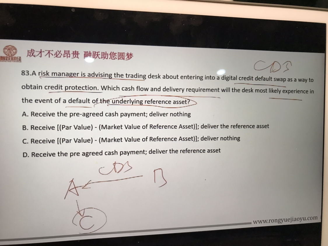 同学,CDS的结算有三种形式:现金交割就是C,实物交割就是D,digital 交割就是A,83题目老师讲解的是正确的