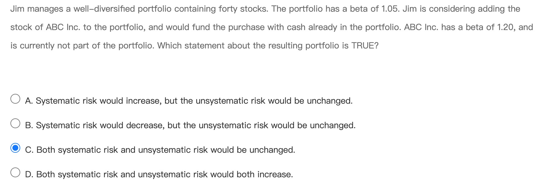投资组合的贝塔增加的是系统性风险,非系统性风险是公司独有的,不是贝塔增加的
