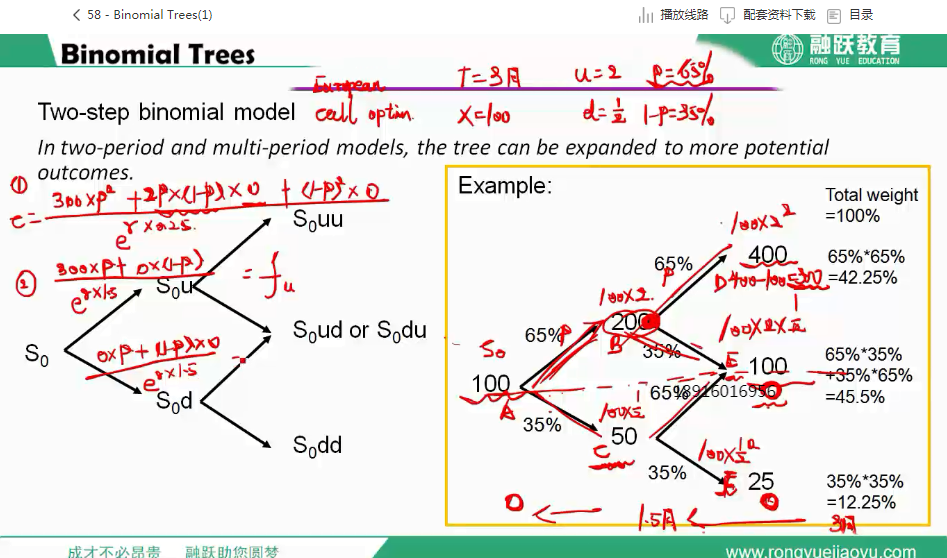 fu是指在一个节点上升概率下的期权价值,fd是指在一个节点下降概率下的期权价值,算出来后与前一节点的价值相比较,取大,最后根据风险中性概率折现至S0点得期权价值