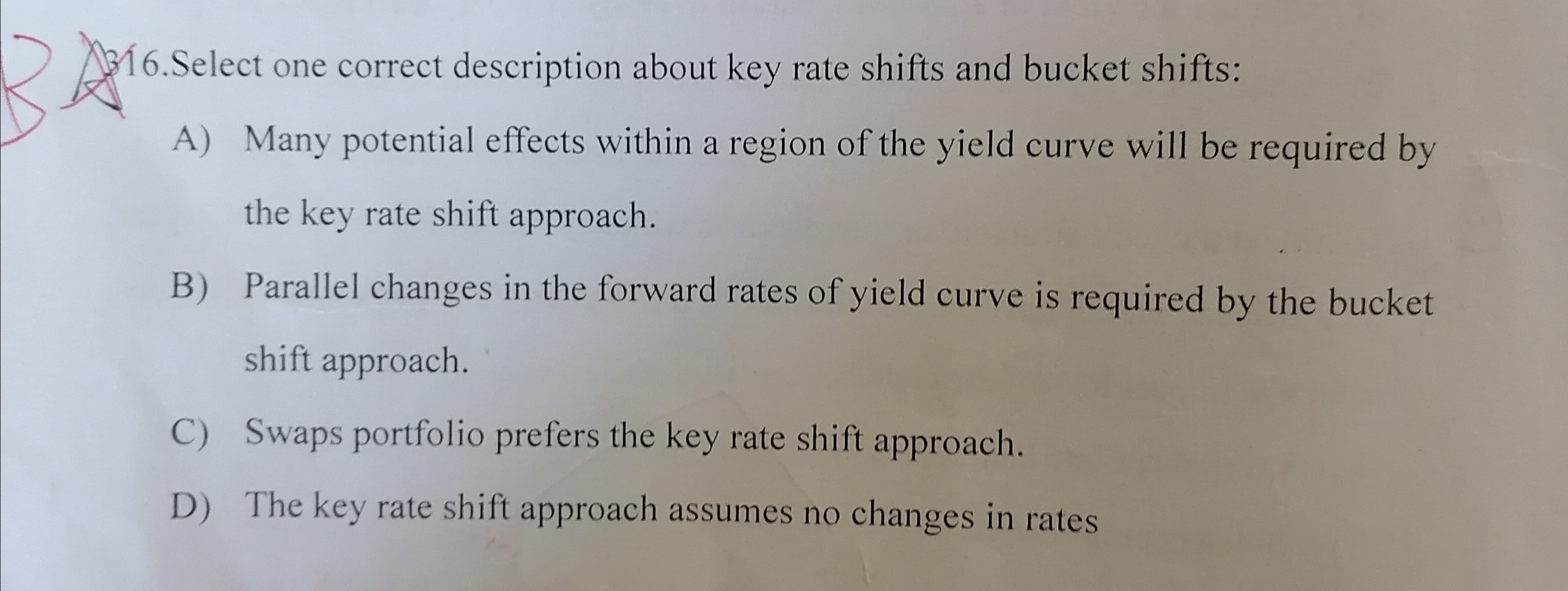 非平行变动用key rate shift,平行变动用bucket shift,故B是对的;A的意思是key rate shift在收益率曲线的一个区域内产生很多潜在影响,是不对的,key rate shift只对临近的利率产生影响