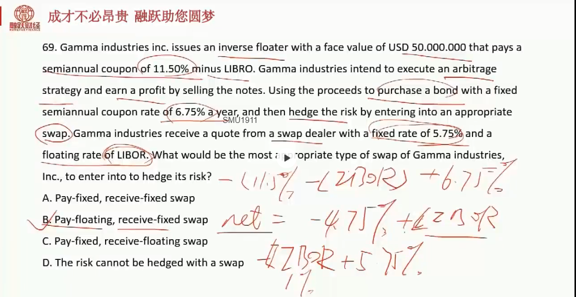 首先感谢老师的回答。我不理解的是题目中已经明确说了Gamma industry会通过receive a fixed rate of 5.75% and a floating rate of LIBOR来进行对冲,为什么答案就还能够是选B来pay floating, receive fixed来对冲呢?非常感谢。
