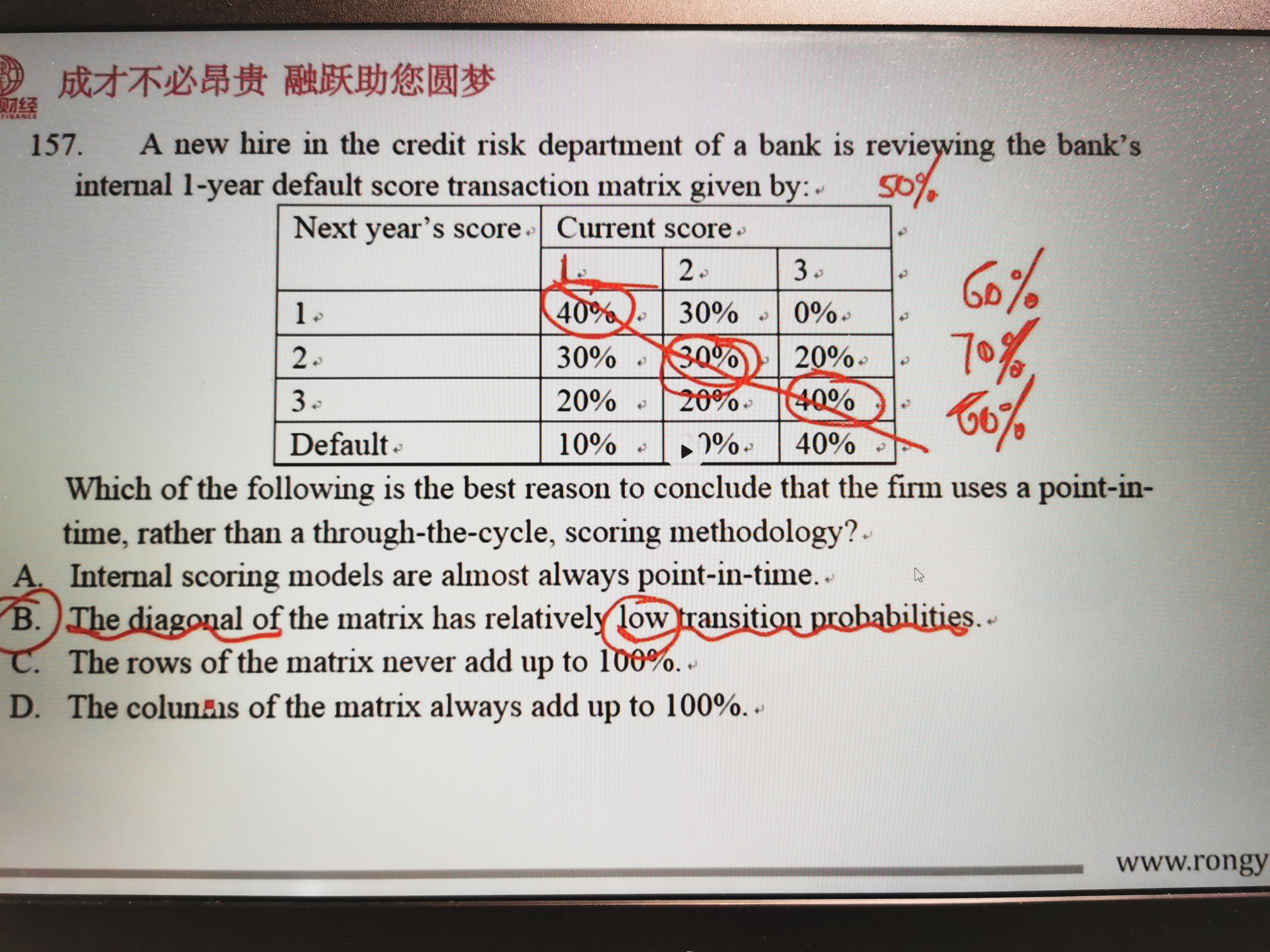 同学你还是没理解我的意思,B选项说的是对角线的概率变动相对较小(正常情况下,对角线的概率也就是评级不变的概率至少都在50%以上),反之,评级发生改变的概率就较大,不是跟时点法评级变动率较大的规律一致吗