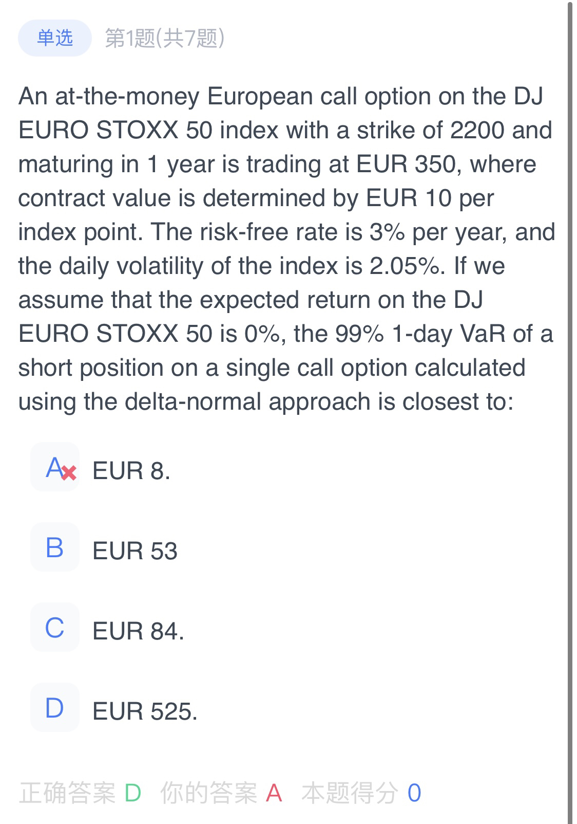 在此题中,at-the-money 的欧式看涨期权的delta是0.5,转换因子是10,故VAR(linear derivative)=△*VAR(underlying risk factor)=0.5*105.083*10=525