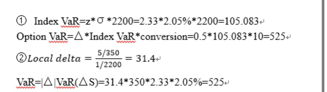 此题是△-normal法求Var,公式是VAR(linear derivative)=△*VAR(underlying risk factor)