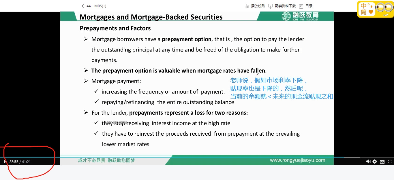 问题1为贴现率这一概念是在折现的时候,用来折现或者用来贴现的时候用的,倒不算一个明确的概念,但是也常用。 问题2,这里老师说的有口误,当市场利率下降的时候,未来现金流贴现求和的值应该是增加的,大于当前所剩余的本金余额。