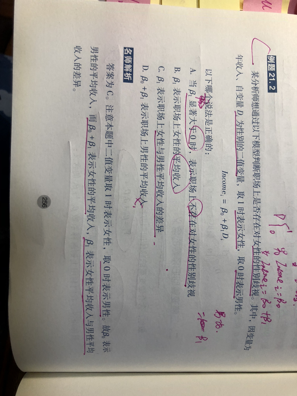 当β1显著大于0时,β0+β1显著大于β0,即女性收入高于男性,但这不能说明是否存在性别歧视,A选项太武断,所以错误