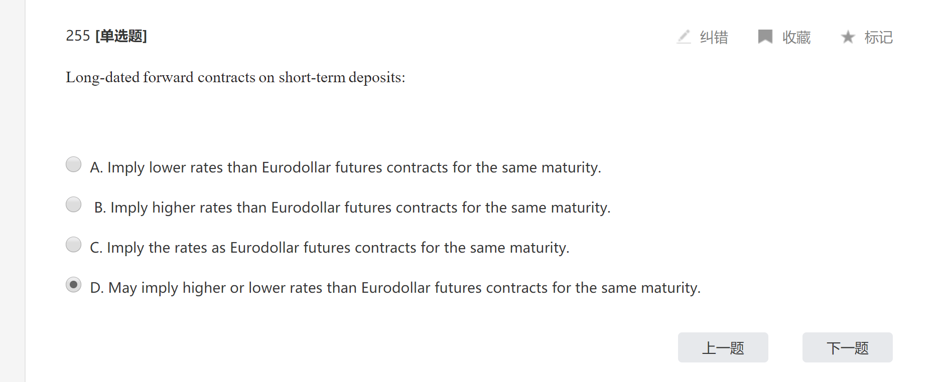 同学你好,这道题考察的是某一标的资产的远期合约FRA的远期利率和对应的期货合约的隐含利率之间的大小比较,由于期货的每日结算制度和远期合约到期结算制度的不同,造成了期货的隐含利率小于实际的远期利率。