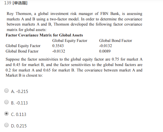 同学,题干中factor covariance matrix分别给出两个因素的方差和协方差,又给出两个因素的系数,即求COV(0.75E+0.2B,0.45E+0.65B)