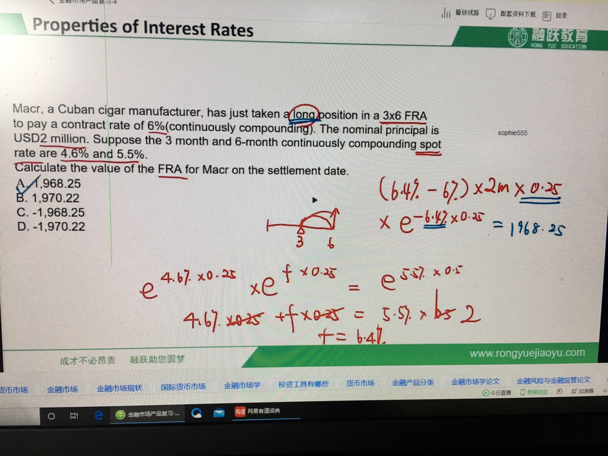 同学你好,FRA的协议是在3个月后开始生效,生效日即交割日,此时就可以计算合约收益(因为此时多头就要开始按照合约约定的利率进行贷款,计息开始,为期3个月),根据计算出的为期3个月的远期利率为6.4%,与合约约定的6%,有一个差值,这个差额利率乘以本金就是合约期限到期后的价值再折现到3个月前即交割日,就是交割日即结算日的合约价值。