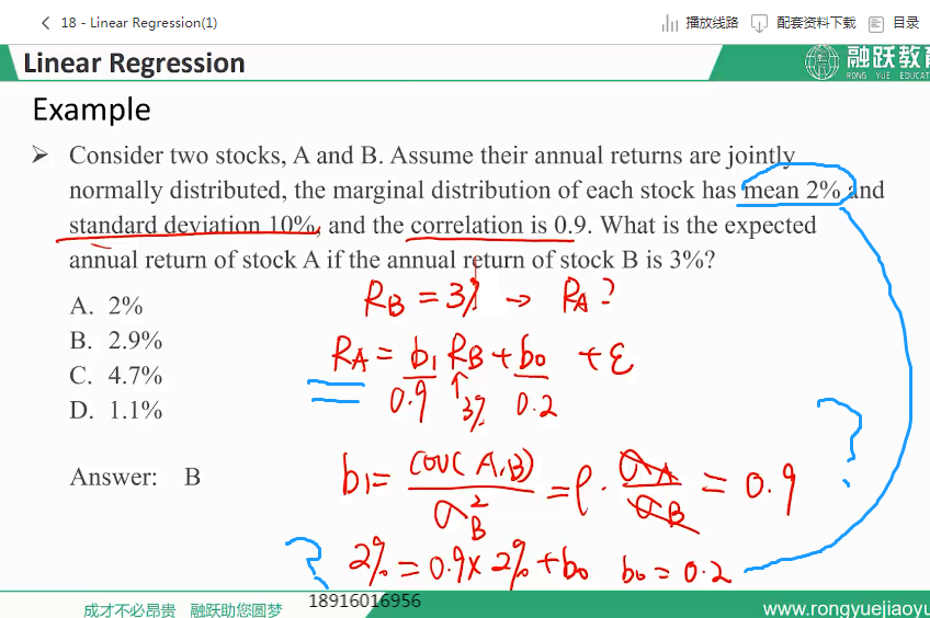 同学你好,题目先利用β的计算公式求出b1,然后再求b0,题目中的mean就相当于OLS法中的X回归均值,根据回归直线一定穿过X的均值和Y的均值点(也就是股票A和股票B的均值),带入回归方程,求出截距项,得出回归方程。最后已知自变量X某一年的股票A的年收益率带入回归方程,求出此时对应的因变量Y某一年的股票B的年收益率。